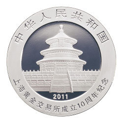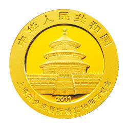 中国人民银行定于2011年10月28日发行上海黄金交易所成立10周年熊猫加字金银纪念币一套。该套纪念币共2枚,其中金币1枚,银币1枚,均为中华人民共和国法定货币。