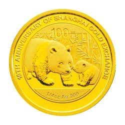 1/4盎司圆形金质纪念币背面图案为母子熊猫图,并刊“1/4oz Au .999”字样、“上海黄金交易所成立10周年纪念”英文字样及面额。