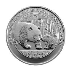 1盎司圆形银质纪念币背面图案为母子熊猫图,并刊“1oz Ag .999”字样、“上海黄金交易所成立10周年纪念”英文字样及面额。