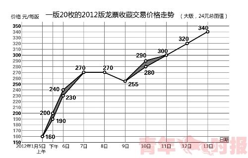 谈起最近“龙票”的行情,杭州收藏品市场经理蔡秋声形容为“龙腾虎跃,上蹿下跳”。蔡秋声说,以俗称“大版”的龙票为例,一版20枚,单枚面值1.20元,总面值24元。1月5日发行第一天,就从24元直接“蹿”到了200元,接下来数天,一路飙升,偶尔回落。昨天,这款邮票达到了340元的新高。这样算起来,9天涨了13倍。