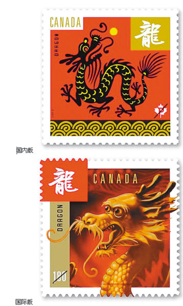 这些邮票设计多姿多彩、气象万千,汇集成了一大套中国龙的形象图谱:美国发行的生肖龙票,以民间舞龙之龙首入画,昂首巨龙,威风八面,给人一种至高无上的神圣感。其采用无面值的“永久邮票”永远不会过期,所以,美国的生肖龙票最值钱;澳大利亚的龙票,为一枚乌龙,一枚苍龙,大红铺底,色彩夺目鲜艳;加拿大的龙票,龙体周身鳞片用金箔装饰,富丽堂皇,显得无比尊贵;日本的龙票以玩具类手工艺品为素材设计,显得温柔可爱,富有一种天真烂漫的童趣;韩国的龙票最有创意,以雪花衬出一条矫健俊朗、英气灵动的“银龙”来。加之使用特种油墨的印刷,雪花和龙体会在黑暗中熠熠闪光,非常惹人喜爱;新西兰的龙票一共四枚,一枚选用中国剪纸龙,一枚似选用飞升在空中的风筝龙,加上一枚黑色的繁体龙字,背衬以镶边之祥云,最后一枚是两只象征和平的红色鸽子;法国的龙票,以金龙飞腾为主图设计,票面左上方红色的“龙年”二字很醒目,在小型张中间又多加成“中国龙年”四字,以突显专为庆贺中国龙年春节的主题……这些龙票,无不显示了设计者对中国文化的热爱和了解,富含诸多中国元素,值得大家仔细欣赏和品味。