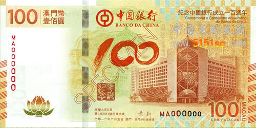 据中银澳门分行总经理叶一新介绍,“中国银行成立一百周年澳门币纪念钞”面额为一百元,可流通,发行量为300万张。其设计融合了中国的传统与澳门的莲花象征。这次发行为溢价销售,全部盈余将捐赠予澳门慈善事业。在澳门地区公开销售不少于100万张,销售对象为持有澳门永久/非永久性居民身份证人士,每人可一次性购买2张;每张连装帧售价澳门币150元。