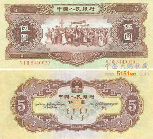 第一版就是1955年3月1日发行的1953版酱紫色五元,为海鸥五星水印。该币现在价值参考为:全新挺版8000元。这种5元由苏联代印,与三元,十元统称“苏三币”,由于上世纪60年代中苏关系恶化,1964年4月14日,中国人民银行发布《关于收回三种人民币票券的通告》,决定从1964年4月15日开始限期收回苏联代印的1953年版的3元、5元和10元券。1964年5月15日,“苏三币”停止收兑和流通使用。